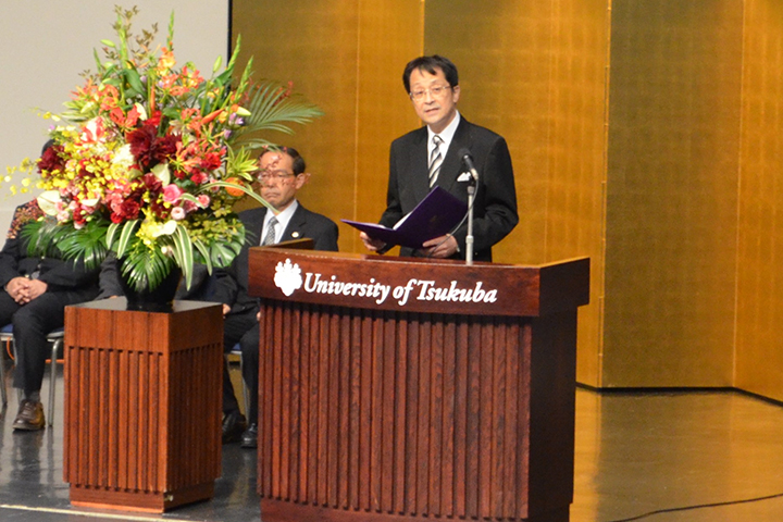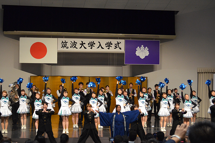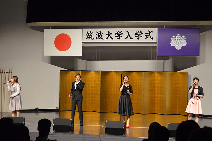 Mai Takafuji(Graduate School of Comprehensive Human Sciences), Yuki Sato(Graduate School of Comprehensive Human Sciences), Marina Yasuda(Graduate School of Life and Environmental Sciences), and Chise Togawa(School of Humanities and Culture) performed welcome song(University of Tsukuba's message song "IMAGINE THE FUTURE") after the ceremony. Subsequently, WINS, the University of Tsukuba's cheering group, sent cheers to the incoming students.
