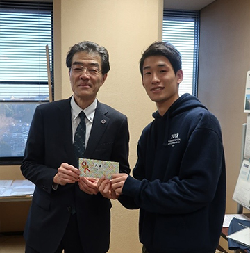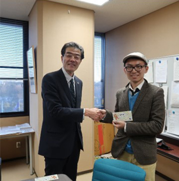 Vice President for Student Affairs Shinobu Satoh (left) and Mr. Keita Sugiura, Selected works winner (Right)
