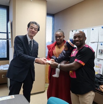 Commemorative group photo, from the left Mr. Keita Sugiura, Vice President for Student Affairs Shinobu Satoh, Mr. Zhu Daoyuan, and Mr. and Mrs. Onyejelem