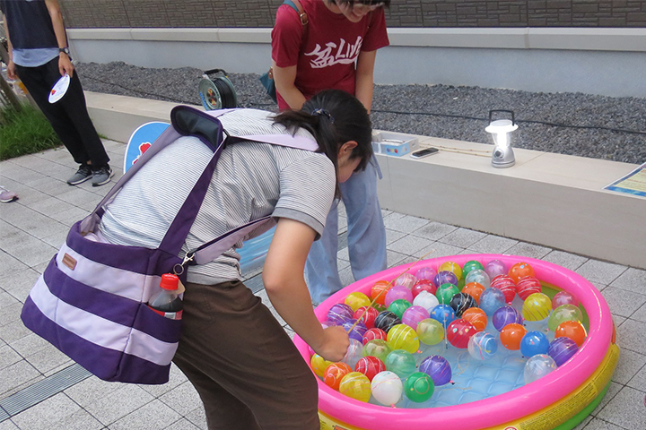 According to the festival concept of dropping in, a large variety of booths were opened such as yukata, a casual version of the kimono, dressing service for female international students, water balloon fishing and Katanuki (cutting specified shape out of a flat cracker), struck-out, experience of Origami (paper folding) and round paper fan decorations guided by the staff members of 'Ask Us Desk' of the university. Moreover, some festival participants had an excellent time to enjoy the summer in Japan, joining in the circle formation of Bon dance following shouts of the university's T-ACT group 'Bon LIVE'.