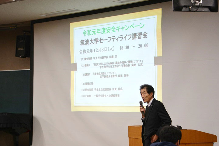 Vice President SATOH Shinobu (Student Affairs) first gave a greeting. Subsequently, Mr. KIKUCHI Fumitake, Chief of Division of Student Welfare (Student Support), gave a lecture on the current status and issues of incidents or accidents in the University of Tsukuba and then encouraged students to prevent crimes and other trouble through specific examples of drinking troubles and an account of incidents with University of Tsukuba students as victims and offenders.