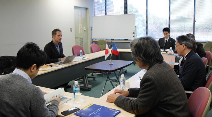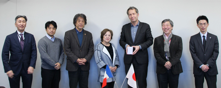 Dr. Sebastien Lechevalier, President of the France-Japan Foundation (FFJ) of the Ecole des Hautes Etudes en Sciences Sociales (EHESS) made a courtesy visit to Vice President BENTON Caroline F. (Global Affairs), Executive Officer AOKI Saburo, Dean of the Faculty of Humanities and Social Sciences, Executive Officer OHNEDA Osamu, Director of the Office of Global Initiatives, Dean TAKENAKA Yoshihiko of the Graduate School of Humanities and Social Sciences, Professor YAMANAKA Toshimasa of the Faculty of Art and Design, and Associate Professor OHNIWA Ryosuke of the Faculty of Medicine on December 24. In the visit, they had a dialogue on exchanges between EHESS・FFJ and the University of Tsukuba not only in the past but also in the future.