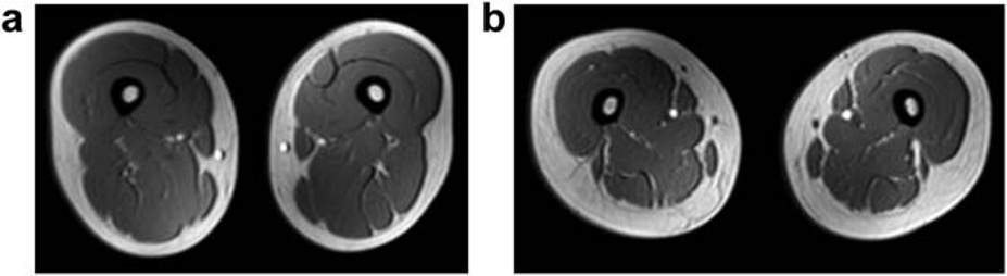 Figure: Representative magnetic resonance images of the femoral region in a female subject without non-alcoholic fatty liver disease (NAFLD) (a) and that in a female subject with NAFLD (b). The NAFLD subject had greater s.c. fat thickness, decreased muscle cross-sec-tion, and marbled muscles (steatosis) on the images.