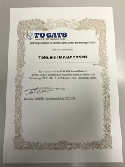 今林拓海さん(数理物質科学研究科 物性・分子工学専攻(修士課程)1年,指導教員:数理物質系 中村潤児教授)は,8月5日から10日までパシフィコ横浜で開催された国際会議「The 8th Tokyo Conference on Advanced Catalytic Science and Technology (TOCAT8) 」において,「Vibration-driven reaction of CO2 on Cu surface via Eley-Rideal type mechanism」と題するポスター発表を行い「Poster Prize」に選出されました。
