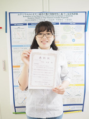 下村日夏さん(数理物質科学研究科(博士前期課程)化学専攻1年、指導教員:数理物質系 小島隆彦教授)が、平成30年11月1-2日に九州大学で開催された第51回酸化反応討論会において、「ルテニウム(IV)-オキソ錯体の電子移動特性に基づく反応性評価」と題するポスター発表を行い、ポスター賞を受賞しました。