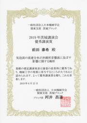 前田泰希さん(システム情報工学研究科(博士前期課程)構造エネルギー工学専攻博士前期課程1年、指導教員:システム情報系 金川哲也助教)は、2019年8月22日に茨城大学日立キャンパスで開催された、日本機械学会2019年茨城講演会において、優秀講演賞を受賞しました。
