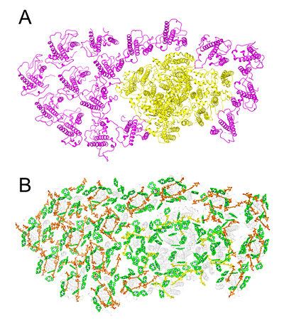 図. 珪藻の光化学系I-FCP複合体の全体構造(A)と色素分子の配置(B)。(A)黄色は光化学系I、桃色はFCP。(B)珪藻の光化学系I-FCP複合体中の色素分子の配置。緑色はクロロフィル、黄色・橙色はカロテノイド。