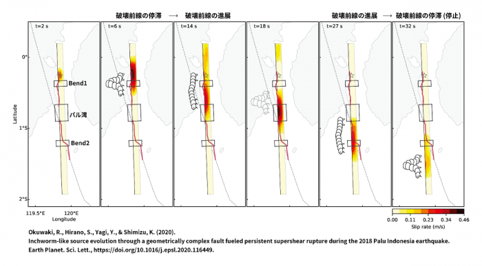 本研究では、2018年にインドネシアで発生したマグニチュード(M)7.6の巨大地震に対し、世界各地で観測されたその地震波形データを使い、複雑な断層形状と地震破壊成長の関係を詳細に解析する最新手法を適用しました。その結果、超せん断速度で進展する破壊前線は、まるで尺取り虫が進むように停滞と進展を伴いながら伝播することが分かりました。