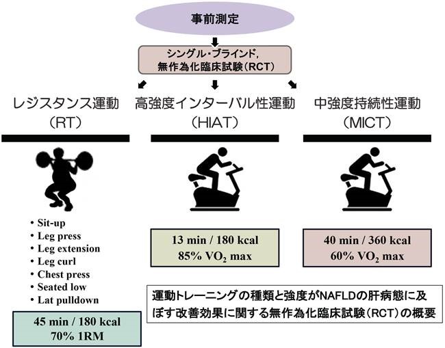 図 運動トレーニングの種類と強度が非アルコール性脂肪性肝疾患(NAFLD)の肝病態に及ぼす改善効果に関する無作為化臨床試験の概要