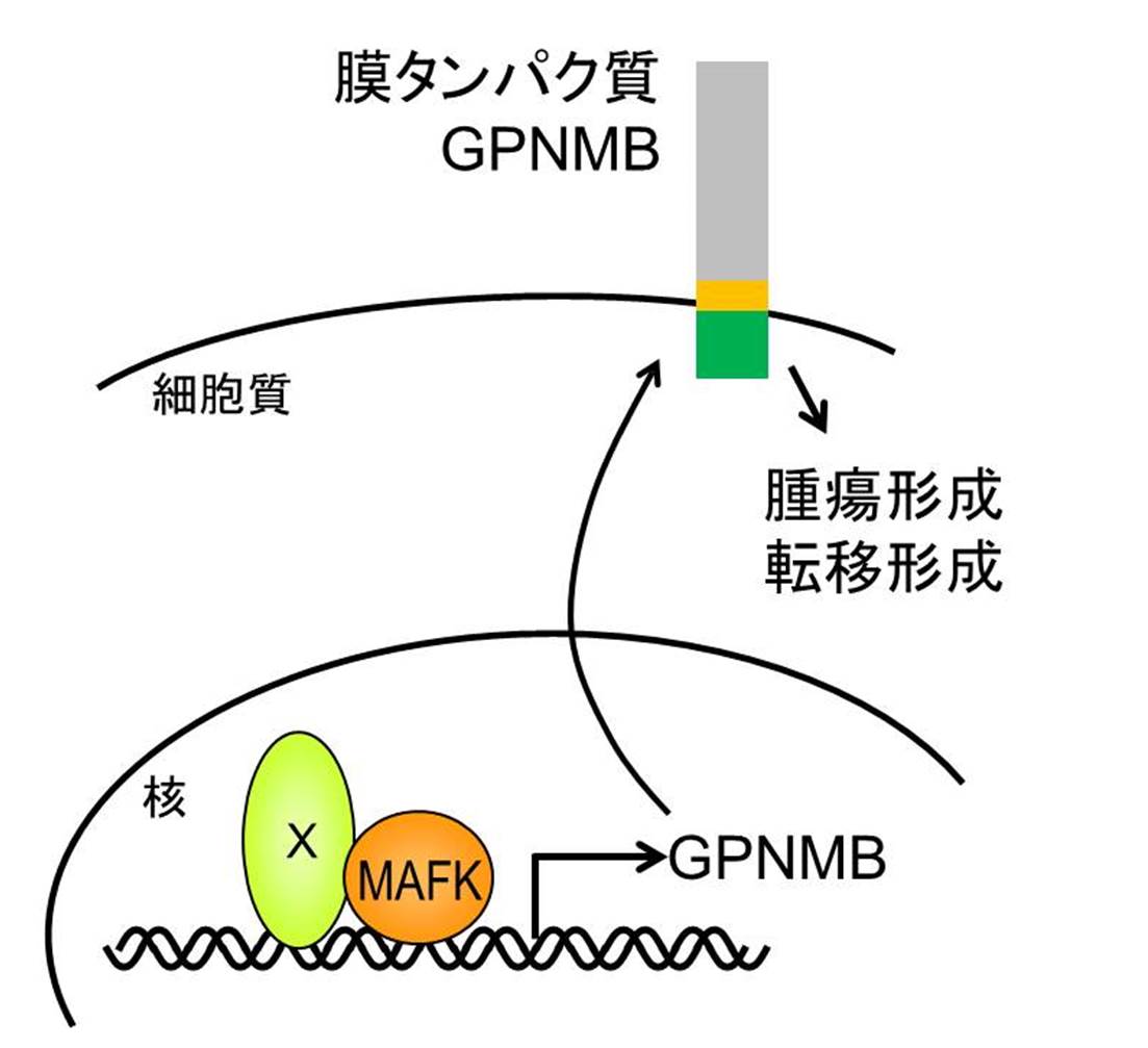 図 転写因子MAFKは、膜タンパク質GPNMBの発現を誘導することで、乳がんの腫瘍形成と転移形成に関与する。