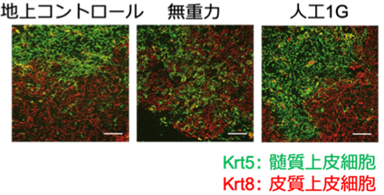 胸腺組織の免疫組織染色図、緑が髄質の上皮細胞、赤が皮質の上皮細胞を示している。髄質領域に存在する上皮細胞の一部が、無重力飼育マウスでは異所的に皮質領域で点在している。この点在異常は、人工1G飼育マウスの胸腺では見られないことが分かる。スケールバー(白線)は100μm。
