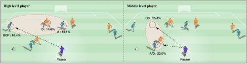 図 大学トップレベルサッカー選手(High level player)と平均的なサッカー選手(Middle level player)が見ていた場所の違い