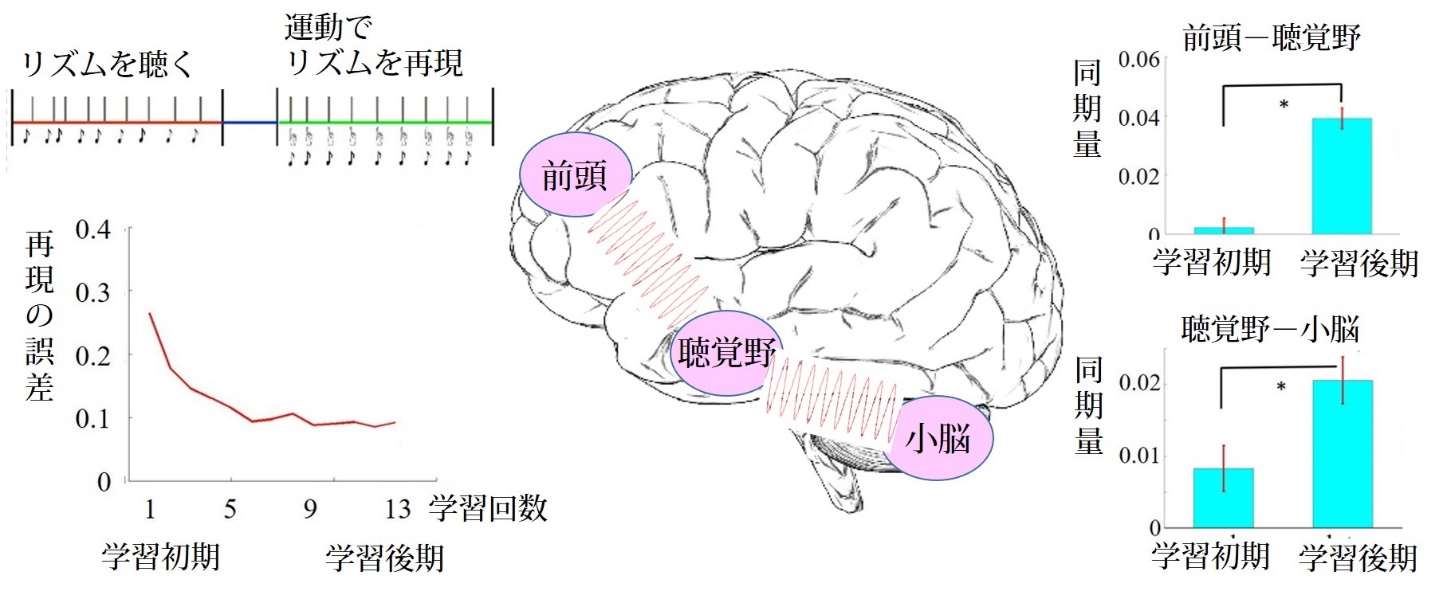 図1.(左上)リズム再現課題の流れ図。(左下)学習回数に対するリズム再現率。誤差0.1付近まで低下した後はほぼ横ばいとなる。(中央)前頭、聴覚野、小脳の位置。(右上)学習初期と後期における前頭と聴覚野の脳波位相同期。(右下)学習初期と後期における聴覚野と小脳の脳波位相同期。