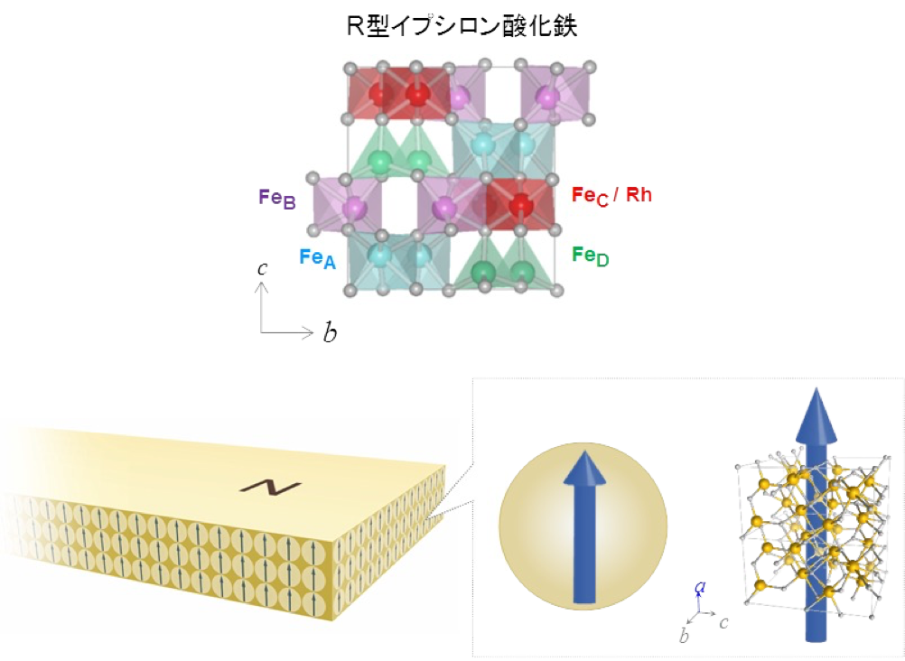 図 ロジウム置換型イプシロン酸化鉄(R型イプシロン酸化鉄)の結晶構造(上図)と、結晶配向体の模式図(下図)。結晶構造中の水色、紫色、赤色、緑色の大きい球はそれぞれAサイトの鉄、Bサイトの鉄、Cサイトの鉄またはロジウム、Dサイトの鉄を示す。結晶配向体の模式図の球は、R型イプシロン酸化鉄ナノ微粒子を表しており、磁極の方向が、一方向に揃えられている。