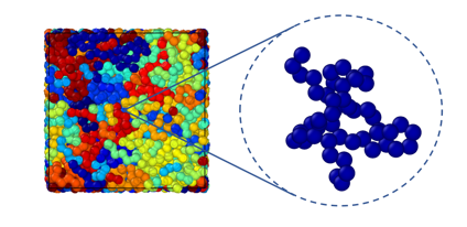 図 高分子鎖の繰り返し分子構造を1つの球とみなしたモデルに基づいた高分子ガラスに対する分子動力学法のスナップショット。