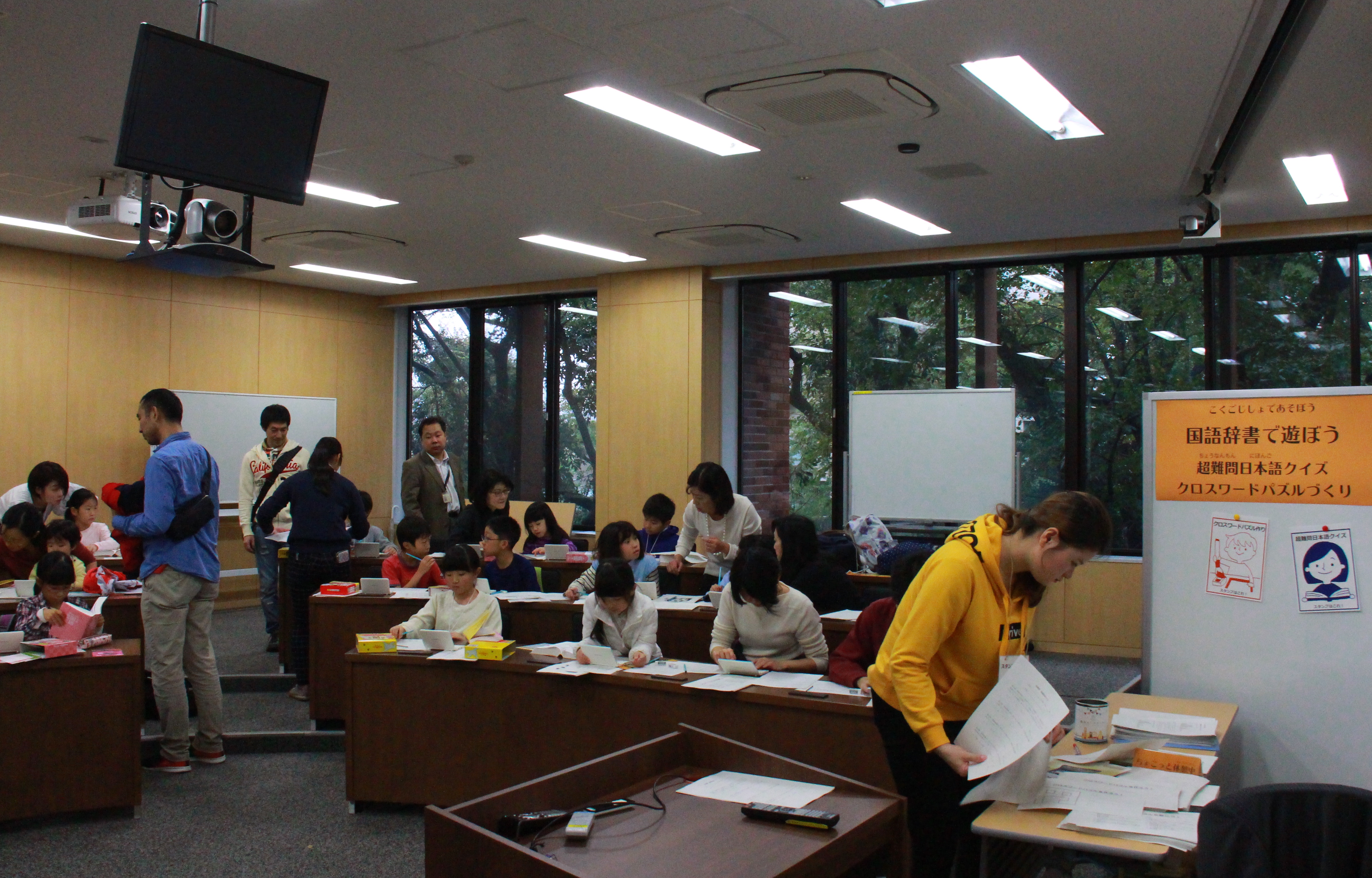 (「国語辞書で遊ぼう」コーナーでは保護者もクロスワードパズル作りに挑戦)