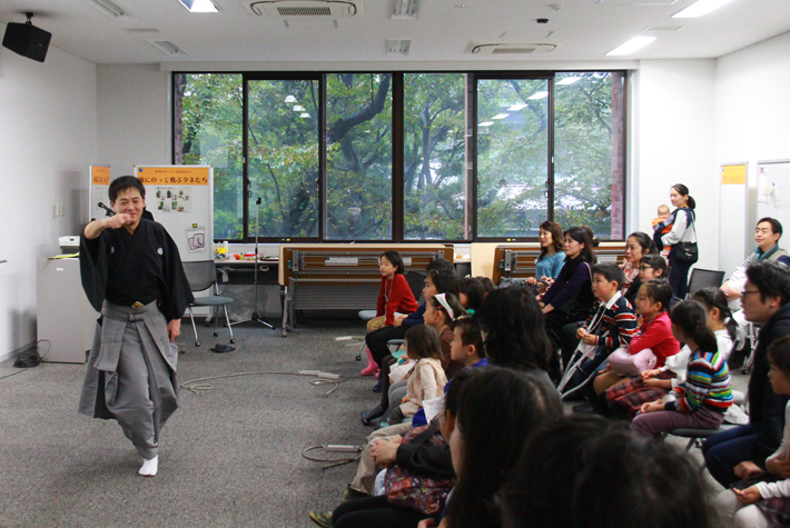 (和泉流狂言師の能村晶人さんによる狂言教室ではみんなも声を出して体験しました)