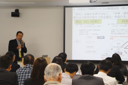 当日は一般参加者のほか,製薬企業や住宅メーカーなど62人が参加し,高細精医療イノベーション棟1階に常設中の「COI参画企業ブース」見学時には,企業や研究者,教員らによる交流や活発な議論が行われました。