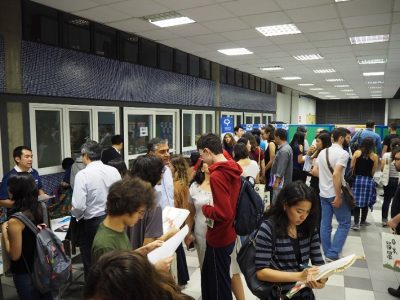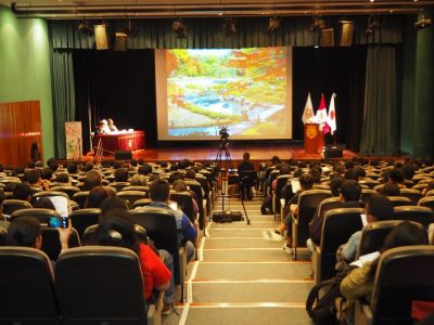 遺跡のある,南米最古のキャンパス内の講堂で留学フェアを行いました。サン・マルコス大学国際部長の挨拶のあと,参加機関のプレゼンテーションが行われました。講堂での説明後の各ブースでの相談時には学生があふれ,長蛇の列ができるほどの熱気に包まれていました。