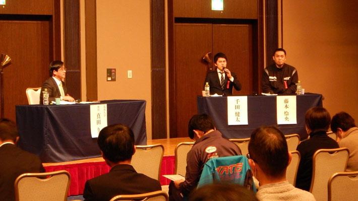 千田健太氏(宮城県気仙沼市出身,2012年ロンドンオリンピック フェンシング男子フルーレ団体銀メダリスト),藤本怜央氏(車椅子バスケットボールチーム宮城MAX所属,2004年アテネパラリンピック以降,4大会連続)がそれぞれ登壇し,競技との出会いから,オリンピックやパラリンピックに出場した経緯,そして東日本大震災後のスポーツを通した復興支援活動などが語られました。