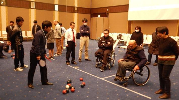 また,ボッチャ体験ゾーンでは,日本ボッチャ協会東北支部の若松伸司氏を講師としてお迎えし,競技特性やルール説明,「ランプ」と呼ばれる補助具の使い方をお話しいただきました。その後,チームに分かれて対戦形式の競技体験を行いました。