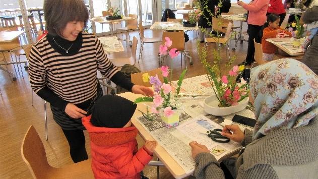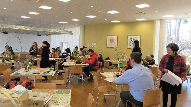 15名(定員)の参加者は,草月流講師である小野萌春先生(虹の会所属)のマンツーマンのご指導の下,「生け花」に挑戦。参加者の中には,小さなお子様連れの外国人研究者のご家族も多く見られ,アットホームな雰囲気の中,各々の個性が光る素晴らしい作品が次々と出来上がり,自身の作品と一緒に笑顔で写真撮影をする姿があちこちで見受けられました。