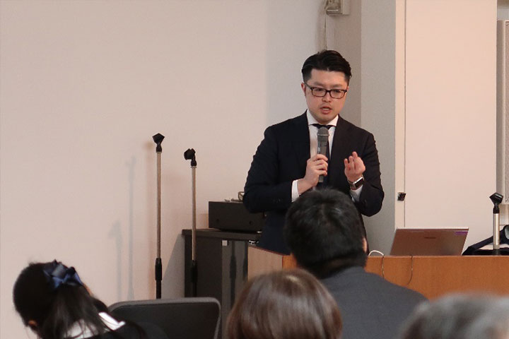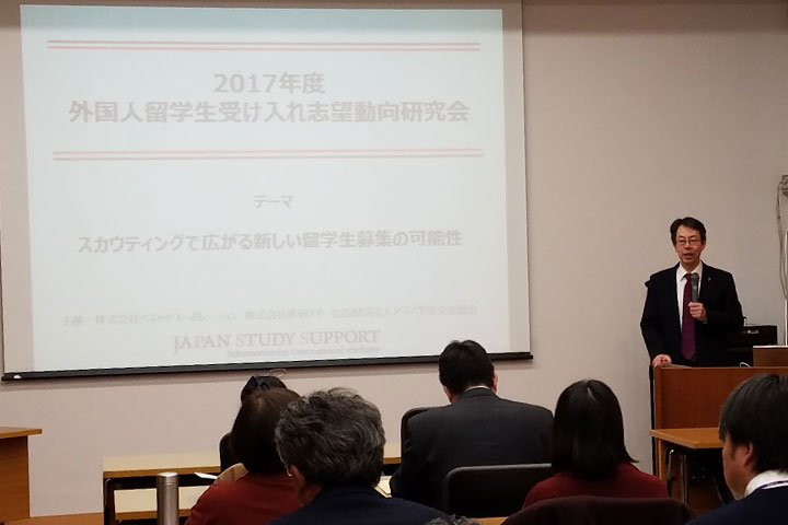 最初に,池田潤学長補佐室長(スーパーグローバル大学事業企画委員会委員長)から開催に当たっての挨拶があり,引き続き,石森氏から,日本の大学の留学生の受入れの現状,近隣諸国の留学生受入れ方策,世界各国の留日動向,日本は世界の留学生からどうみられているのかなど,留学生受入れに当たっての日本を取り巻く状況について説明いただきました。特に,アジア各国のGDPや個人所得の推移等,当該国の社会情勢のデータ分析を踏まえての説明は説得力があり,今後,優秀な留学生を更に受け入れることを計画している本学としては非常に有意義な情報となりました。今回,教員・職員併せて約50名が出席し,活発な質疑応答が行われました。研修会終了後も個別に質問をする者が列をつくるなど,今回のテーマに高い関心があったことが伺われました。