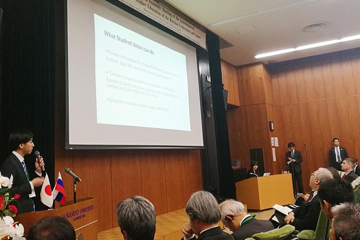 また,日露大学協会総会に先立ち5月19日より実施された「日露学生フォーラム」では,日露間の大学間交流拡大に向けた課題について議論され,20日の総括発表においては,大倉大史さん(人文・文化学群比較文化学類4年)が日本側の代表者の一人として,発表を行いました。