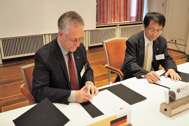 (本学・永田学長とボン大学ホーホ学長によるTEACH協定プログラム更新確認書への署名)