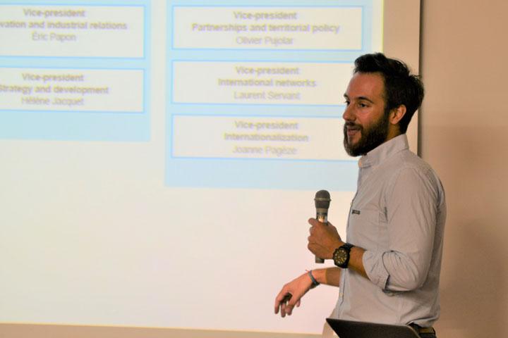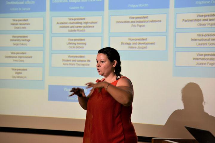 セミナーには,筑波大学の協定校であるフランスのボルドー大学から,企画課長のシンシア・エスピノーサ氏と,国際連携・留学生支援係長のペドロ・サンティアゴ氏をお招きし,ボルドー大学の国際連携強化の方針や,2014年の大学合併がもたらした結果について,英語で学ぶ機会をいただきました。