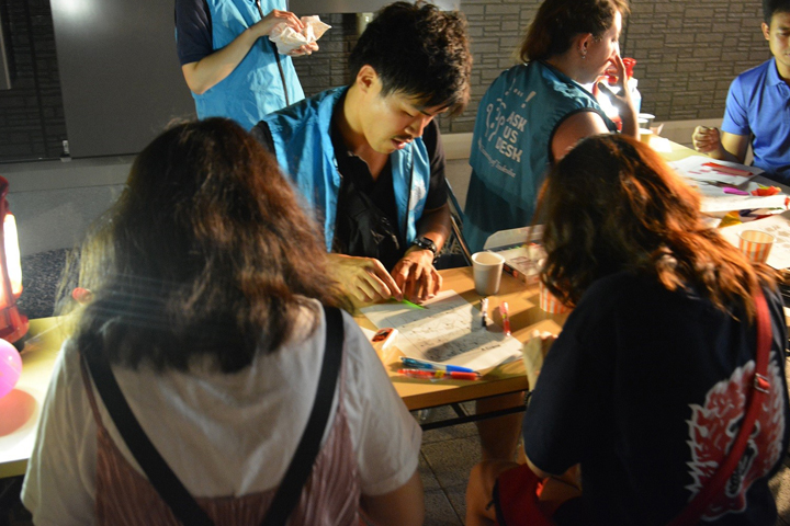 ふらりと立ち寄れる祭りをコンセプトに,ヨーヨー釣りや型抜きなどの日本ならではの遊びや,ストラックアウト,フリスビー投げ,リンボーダンス,本学Ask Us Desk担当による折り紙体験など,多彩なブースが用意され,更にイベント会場では本学学生サークルによる各種演目が催されるなど,夏の暑さにも負けない熱気に包まれました。