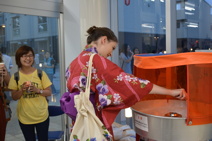 (綿あめ作りを楽しむ留学生)