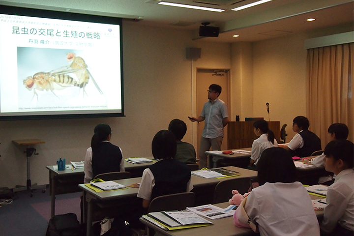 公開講座当日は,朝9時から午後5時まで,センター教員や連携する教員から,最新の知見や研究成果について7つの講義があり,哺乳類・昆虫・魚類・線虫や微生物などを使った研究において,それぞれの生物が生き残るために行う遺伝子レベルの生命現象について解説しました。受講生たちは,高校生にとっては少し難しい内容ながらも理解に努め,疑問に思ったことや判らないことを講師に質問していました。最後の講義では,現在の研究の実施に求められる研究の倫理的側面にも話が及びました。
