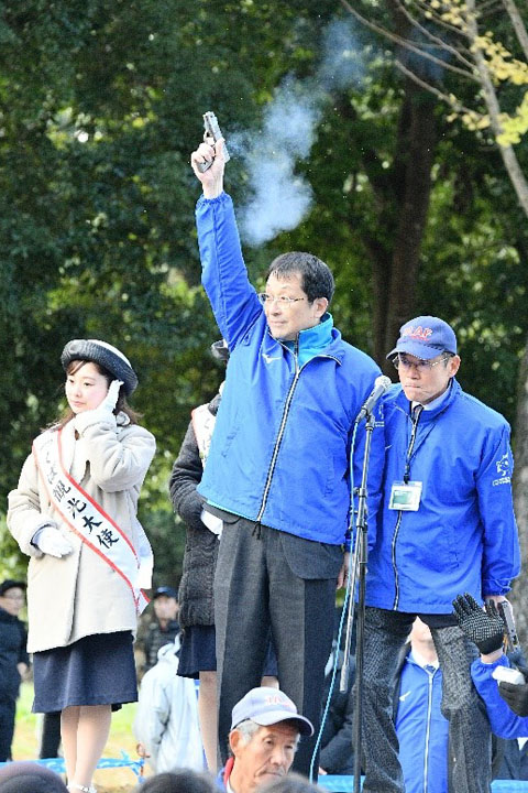 「ウェーブスタート」第3ウェーブでは、永田恭介学長がスターターを務め、約3,000人のランナーを送り出しました。