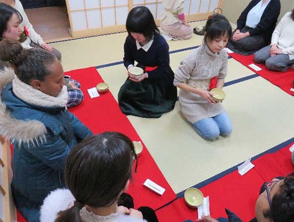 本お茶会は、日本文化である「お茶」を通じて留学生と日本人学生の交流を行うと同時に、他国におけるクリスマス文化も紹介することにより、和洋折衷の文化理解を促進する目的として、本学学生団体である茶道部和敬清寂社とバームクーヘンの会、そして職員ボランティアの協力によって開催されたものです。