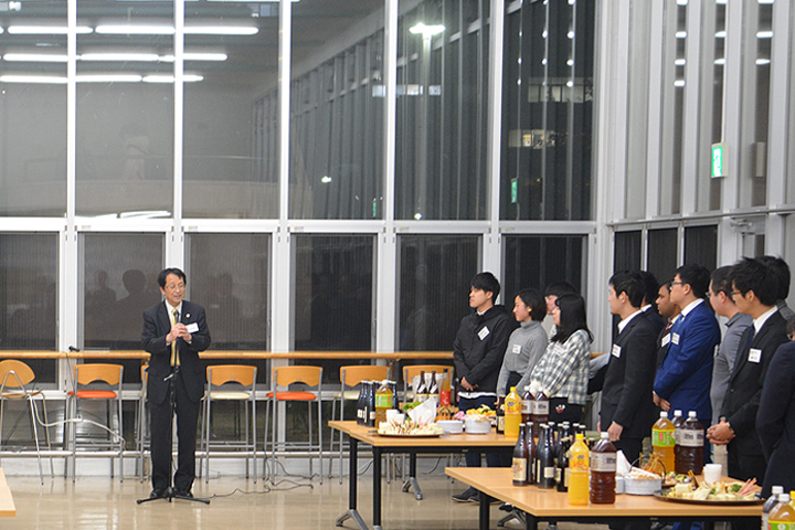 交流会には学長、副学長、大学執行役員、研究科長及び関係部局長等の教職員24名、学生は、第1部参加者に3名(留学生1名を含む。)が合流し、学長や他研究科の学生、教職員と直接対話ができる有意義な交流会となりました。
