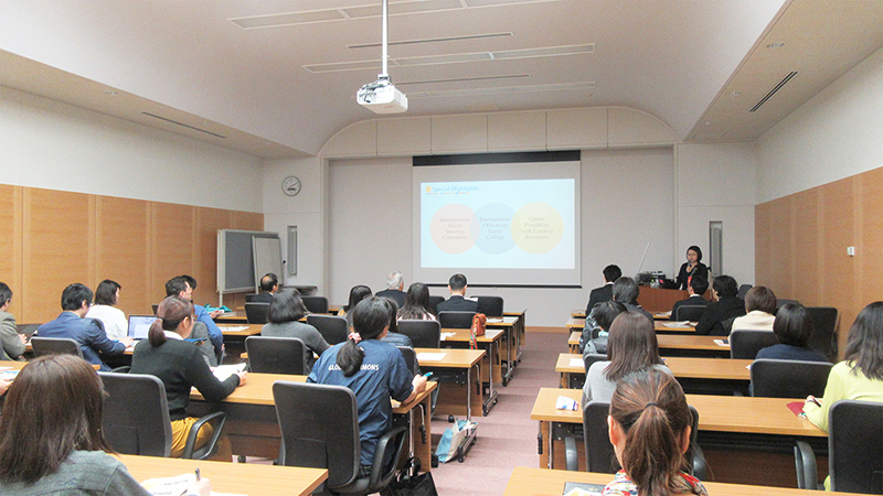 セミナーには、筑波大学のCampus-in-Campus(CiC)協定校である国立台湾大学から、国際室職員のMs. Jennifer Wangをお招きし、国立台湾大学における国際化の取組みや今後の展望等について、英語で講演いただきました。
