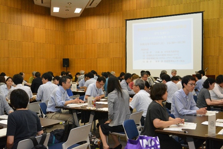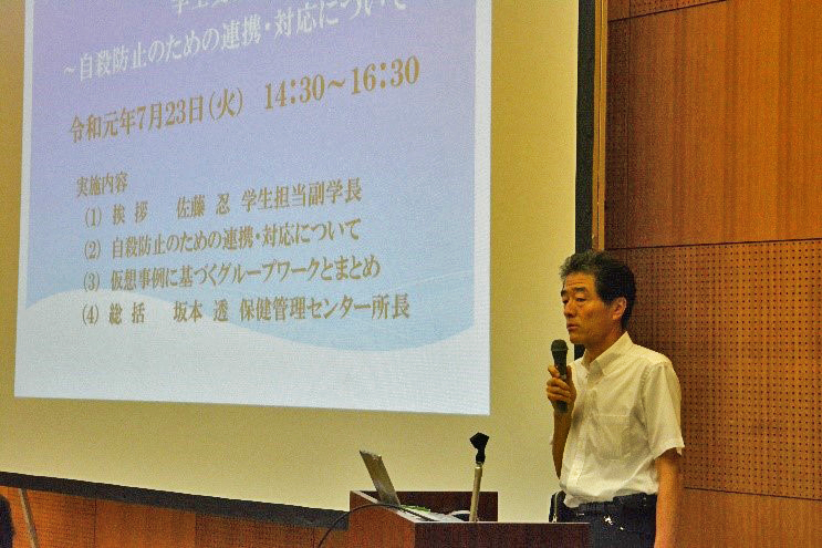 本研修会は、全学的な学生のメンタルヘルス及び自殺などの危機予防対策等の施策について審議するために、学生担当副学長の下に設置されている「学生こころの健康委員会」の主催のもと、例年実施しており、昨年度に引き続き『自殺防止のための連携・対応』をテーマに、各教育組織に設置されている学生支援対応チーム構成員、クラス担任等教員、各エリア支援室職員等を対象に、98名の参加のもと実施しました。