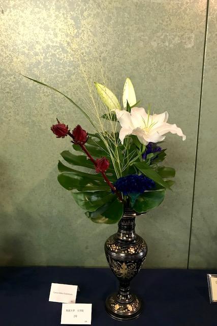 8月24日(土)、25日(日)池坊東京会館にて「学生いけばなフェスティバルin TOKYO」が開催されました。このフェスティバルでは、関東地区で池坊いけばなを学ぶ学生が集い、日頃のお稽古の成果を発表し、思い思いの作品を展示しました。本学からもグローバルヴィレッジにおいて開催中のいけばな教室に参加している Carina Miwa Yoshimuraさん(システム情報工学研究科 3年)と束元奈々さん(芸術専門学群 4年)が作品を披露しました。