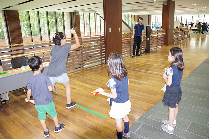 また、球体折り紙や数学パズル、花の基本構造を探る、紙飛行機飛ばしなどのコーナーもにぎわいました。キャンパス内の「占春園」を舞台にした昆虫探検隊では、セミやトンボを追いかける子どもたちの歓声が響き、捕虫網を持った男の子は「将来は新種を発見したい」と息を弾ませていました。