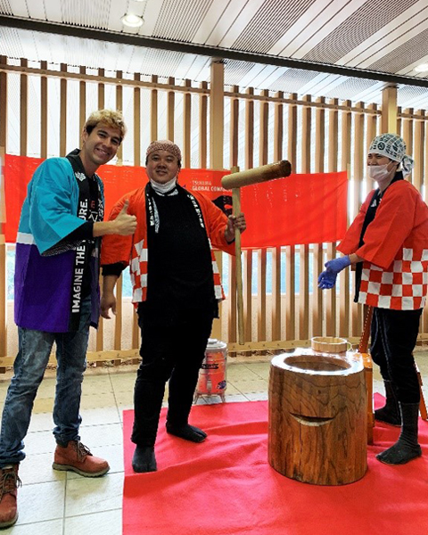 今年は、日ごろ国際交流活動を行っている学生団体や芸術専門学群で書道を専攻する学生らの協力のもと、日本のお正月の伝統行事である「餅つき」と「書初め」文化を広く紹介しました。当日は臼と杵でつきあげる昔ながらの餅つきに多くの留学生、日本人学生らがチャレンジする中、つきたてのお餅を求めて長蛇の列ができるなど、会場は熱気に包まれました。またお餅を食べ終えた参加者らは、書初めでそれぞれの思いを半紙にしたためながら交流し、笑顔で出来上がった作品を持ち帰っていました。