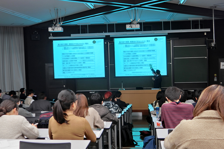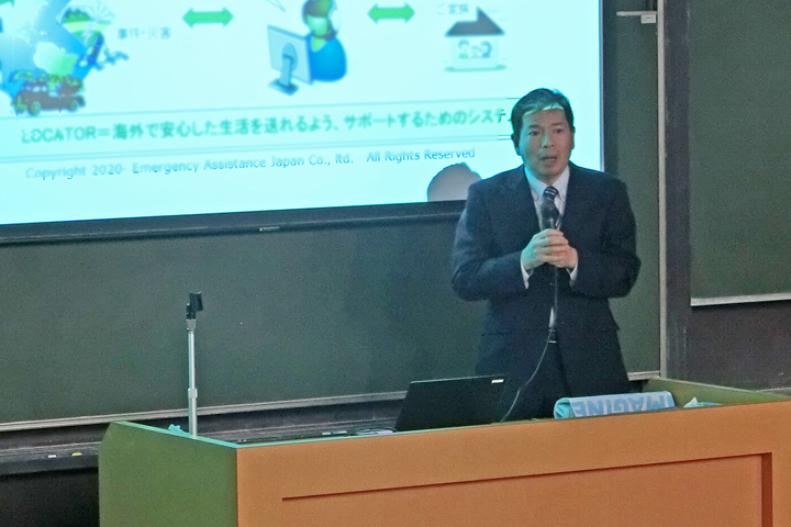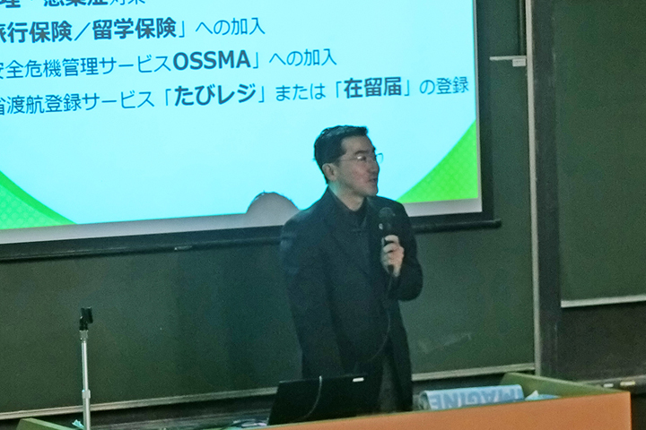 セミナーでは、「安全対策として渡航前準備事項を確認し、海外渡航中の安全管理を考える」のテーマにて、日本エマージェンシ―アシスタンスから齋藤進氏をお招きし、ご講演いただきました。続いて、グローバル・コモンズ機構国際交流支援部門長の野村名可男准教授から、「海外渡航にむけた準備とその心得 -学生の皆さんが海外渡航する際の7つのチェック事項-」について、渡航前の学内手続き等を含めて説明しました。