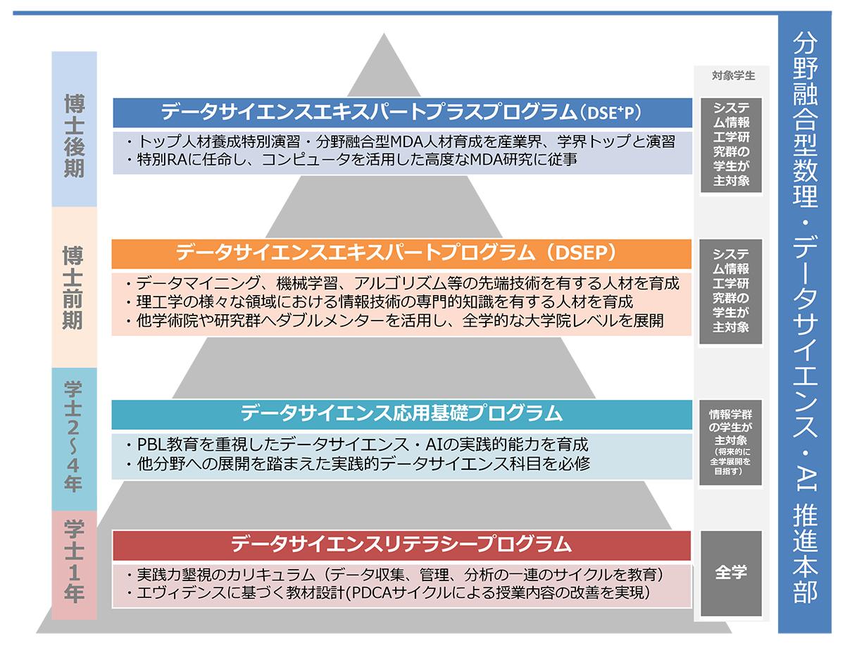なお、学士課程から博士後期課程にいたる全学的な数理・データサイエンス・AI 教育の体制を構築するため、2021年度に教育担当副学長をリーダーとする「分野融合型数理・データサイエンス・AI 推進本部」を設け、本学における全学的なMDA教育を推進しています。